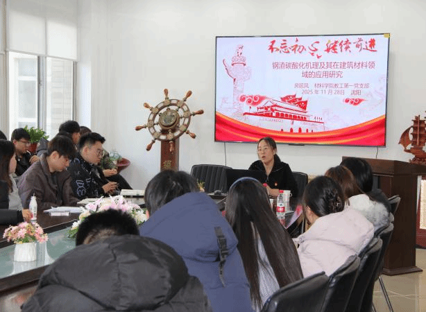 本次活动由党支部书记吴丽梅教授策划组织,支部党员积极参与,材料学院硕士研究共有50余人参活动支部党员丁向群教授学位论文研究中提升综合竞争力的思考这一话题进行了专题讲座,从研究方法、实验设计以及成果转化等方面深入探讨了学术研究的关键思路与策略支部党员房延凤副教授围绕钢渣碳酸化机理及其在建筑材料领域的应用研究展开,分享了自己的研究成果与实践经验,并与相关专业学生进行了深入讨论。